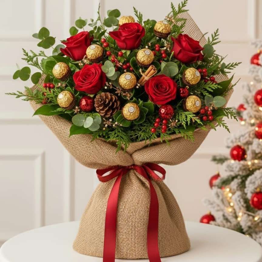 Celebrate the warmth of the season with the Rustic Yuletide Rose Bouquet โ€“ Classic. Featuring rich red roses, festive greenery, and indulgent Ferrero Rocher chocolates, this bouquet is beautifully finished with natural jute wrapping for a cozy, traditional Christmas feel.