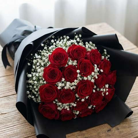 Expertly hand-tied and wrapped in luxurious black premium paper, this bouquet creates a striking visual contrast that enhances the deep beauty of the roses. Whether it’s a romantic surprise, anniversary, or heartfelt gesture, this bouquet speaks volumes without saying a word.